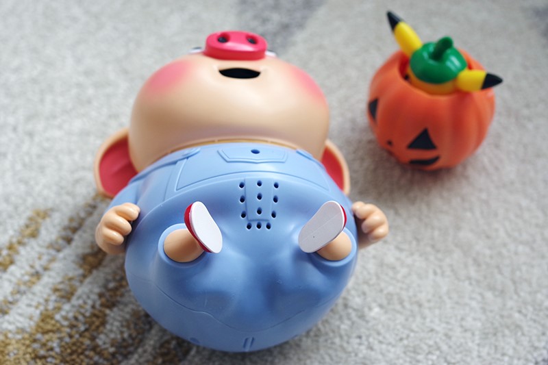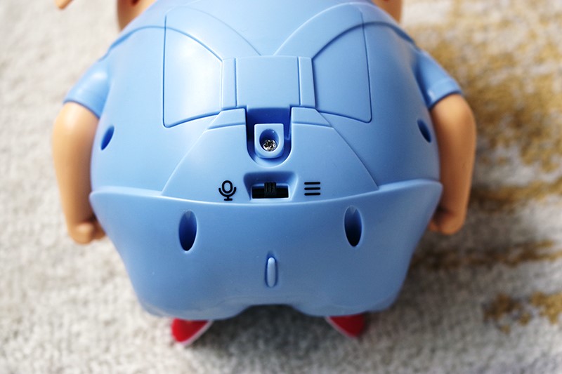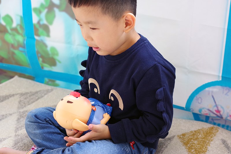 衣服可以拆卸,也正好可以锻炼宝宝的动手能力。他们总是会有办法将衣服脱下来,但是,未必有能力将衣服穿回去。我反正是不会从旁指导,只会告诉宝宝,自己想想刚才是如何将衣服脱下来的,又或者想想自己平时是如何穿衣服的。 ![]() 猪小屁作为早教机的形式出现在儿童智能玩具行列中,最主要的是它的学舌功能。小孩子的世界,我们大人根本不清楚,宝宝说什么,猪小屁就重复什么,而且,就算是宝宝说的再不清楚,都可以一样的模仿出来。我试过说英文说日文,甚至是说一些地方的方言,这都不会难倒猪小屁学舌的能力,还原度可以说是百分之百。 以前也接触过学舌类玩具,但那都是来自快餐中的儿童套餐,总是要按住或者按动某一个按钮才可以录音重复。宝宝们却并不是很喜欢那样的玩具,我问过自己家的宝宝,他给我的回答是太麻烦。猪小屁呢,只需要将开关调节到学舌功能位置,随时随地都可以学舌,甚至是不用手持都可以。这也方便宝宝在玩耍其他玩具,也不会影响到与猪小屁的玩耍。